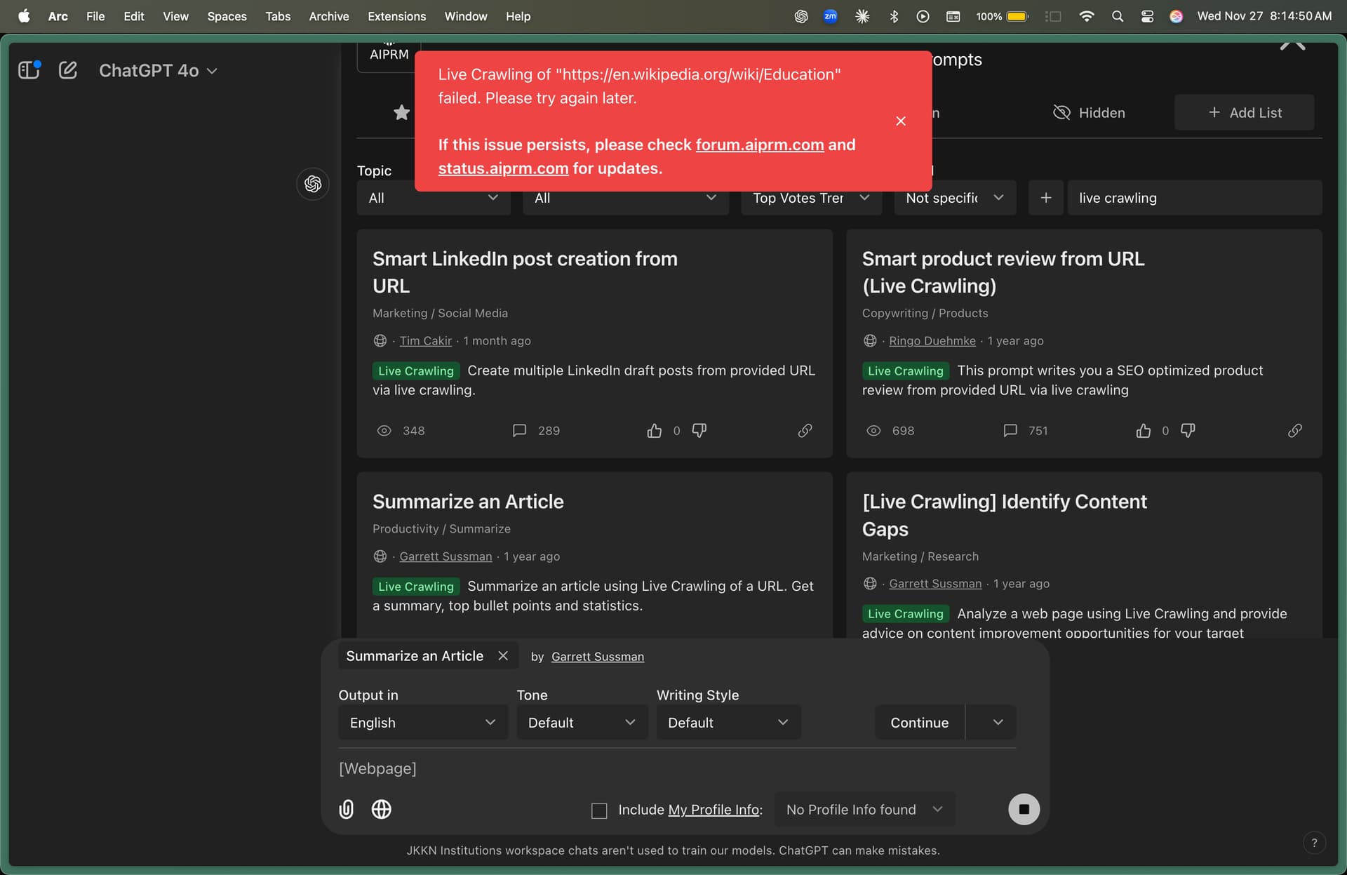 We’re unable to run a certain prompt. It says that live crawling is failed. Please see the screenshot.
